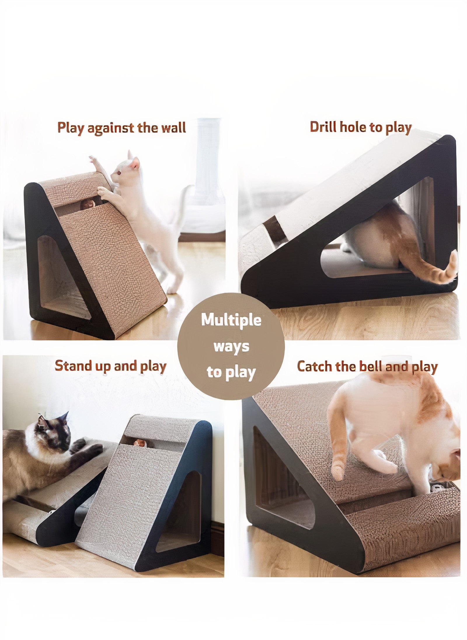 The sleek triangular design fits seamlessly into any room, and the built-in toy balls add an extra layer of fun, stimulating both physical activity and mental curiosity. Whether your cat loves lounging, scratching, or playing, this multi-functional piece is a must-have addition to your home.